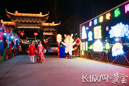 “永清新春灯会在燕南春酒博园进行,从初一一直持续到正月十六。现场设计了‘新春迎门’‘鼓舞中华’‘鱼跃龙门’‘财源滚滚’‘礼赞永清’‘百米长龙迎春纳福’等26个大型主题灯组。”永清县国营林场党支部书记兼燕南春景区专班班长张瀚予介绍说。