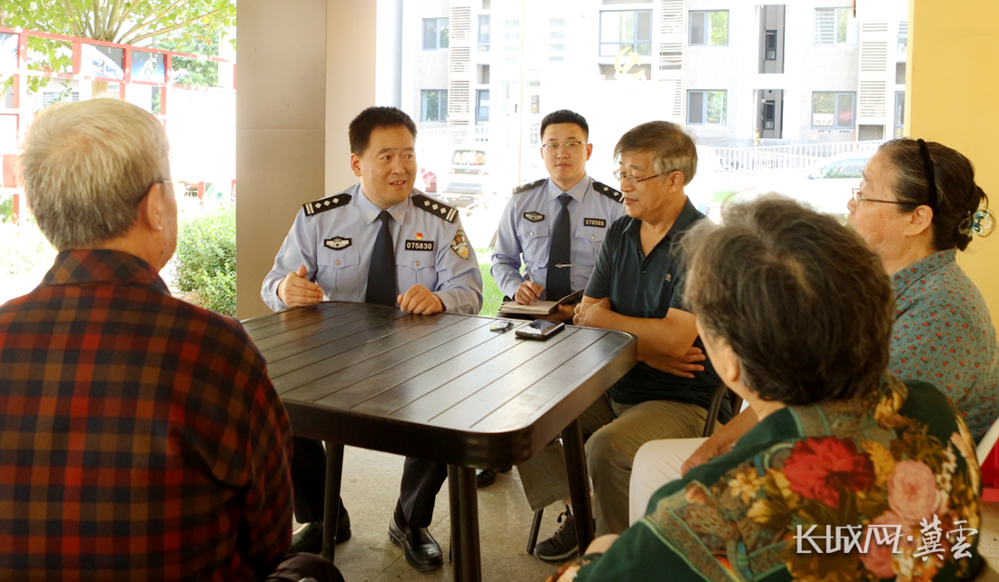 廊坊市公安局安次分局永华道派出所所长李刚(左一)与辖区居民交谈。廊坊市公安局 供图