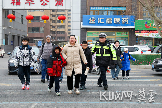 交警在护送学生过马路。通讯员 陈龙 摄